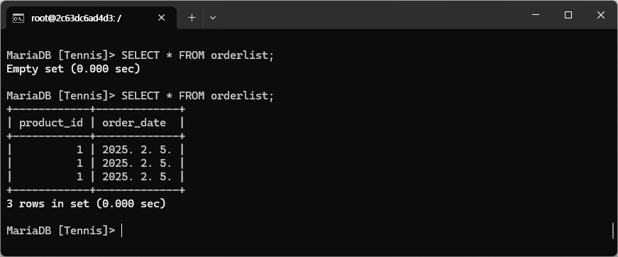 그리고 mariadb의 orderlist 테이블에 INSERT INTO 명령을 실행하면 된다.
