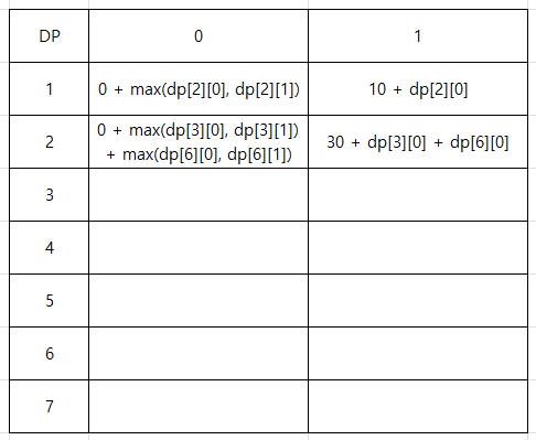 그리고 자식 노드에서 부모 노드로 방문을 하지 않는 것에 유의하며 dp 테이블을 채워나가면 다음과 같을 것이다.