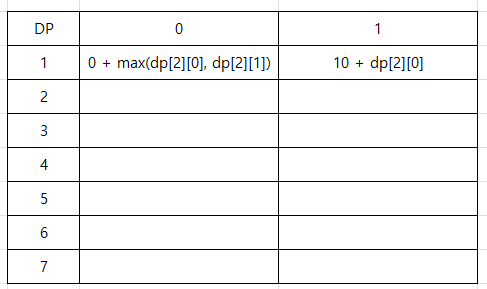 따라서 dp[1][0] = 0 + max(dp[2][0], dp[2][1]) 으로 나타낼 수 있다.