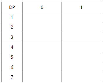 이후 DP 테이블을 채워나가야 하는데 세로에는 노드 번호, 가로에는 노드 포함 여부를 나타내며 각 값은 최대 독립집합의 크기이다.
