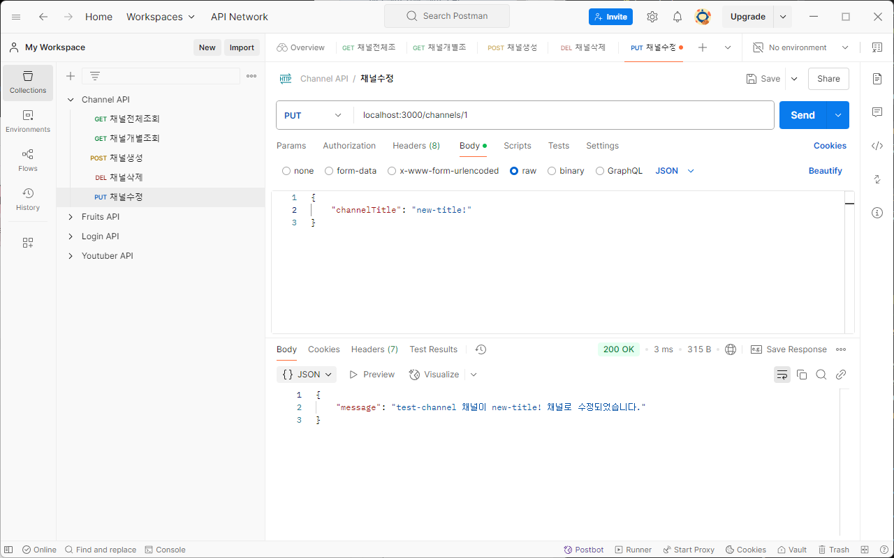 [Node.js] 유튜브 서비스 - 채널 삭제, 채널 수정(DELETE, PUT) 본문