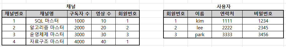 이 때 채널 테이블에서 다른 테이블의 PK를 컬럼으로 사용한 "회원번호"를 FK(Foreign Key, 외래키)라고 한다.