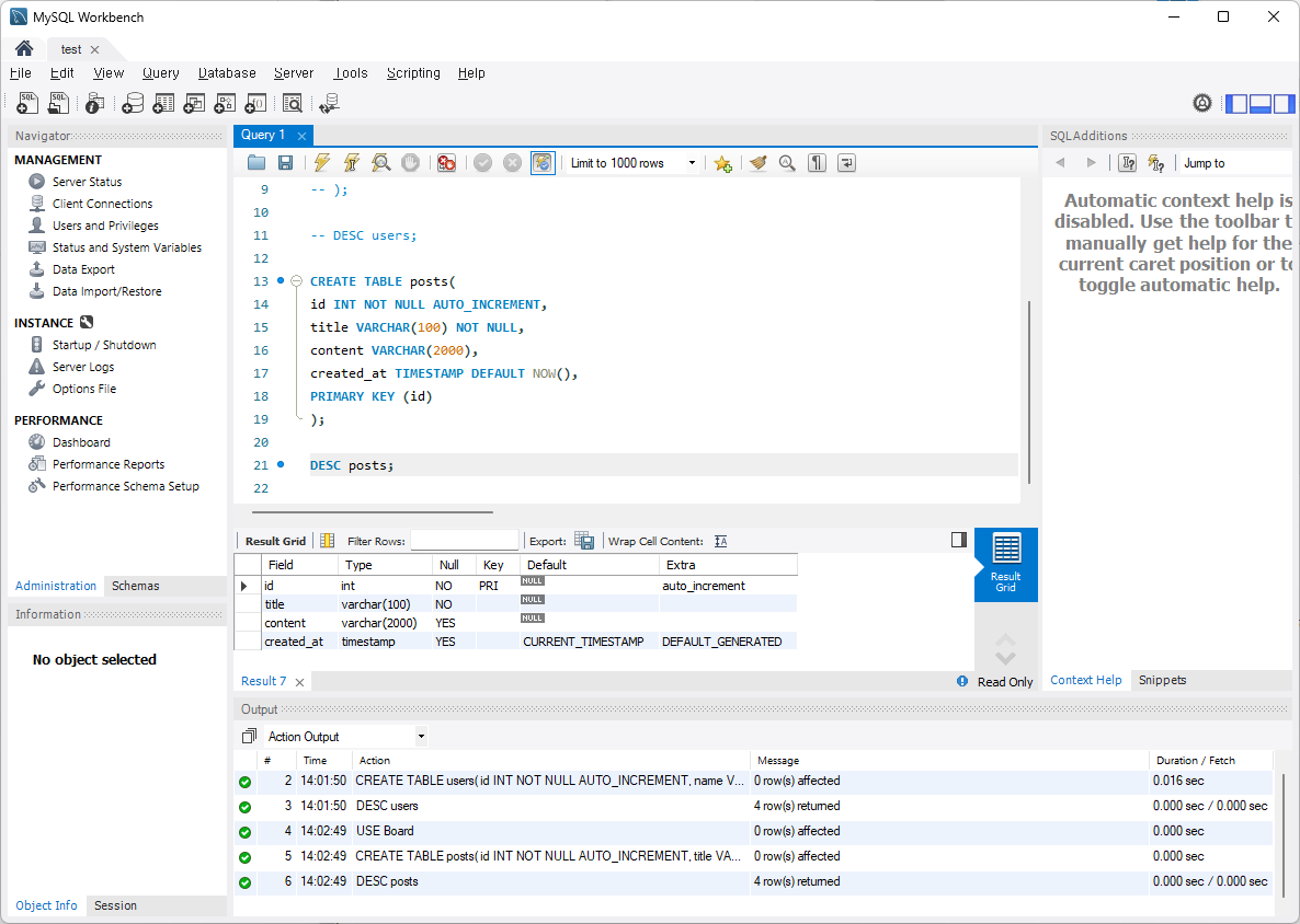 다음으로 INSERT INTO를 통해 posts 테이블에 새로운 데이터를 추가해주었다.