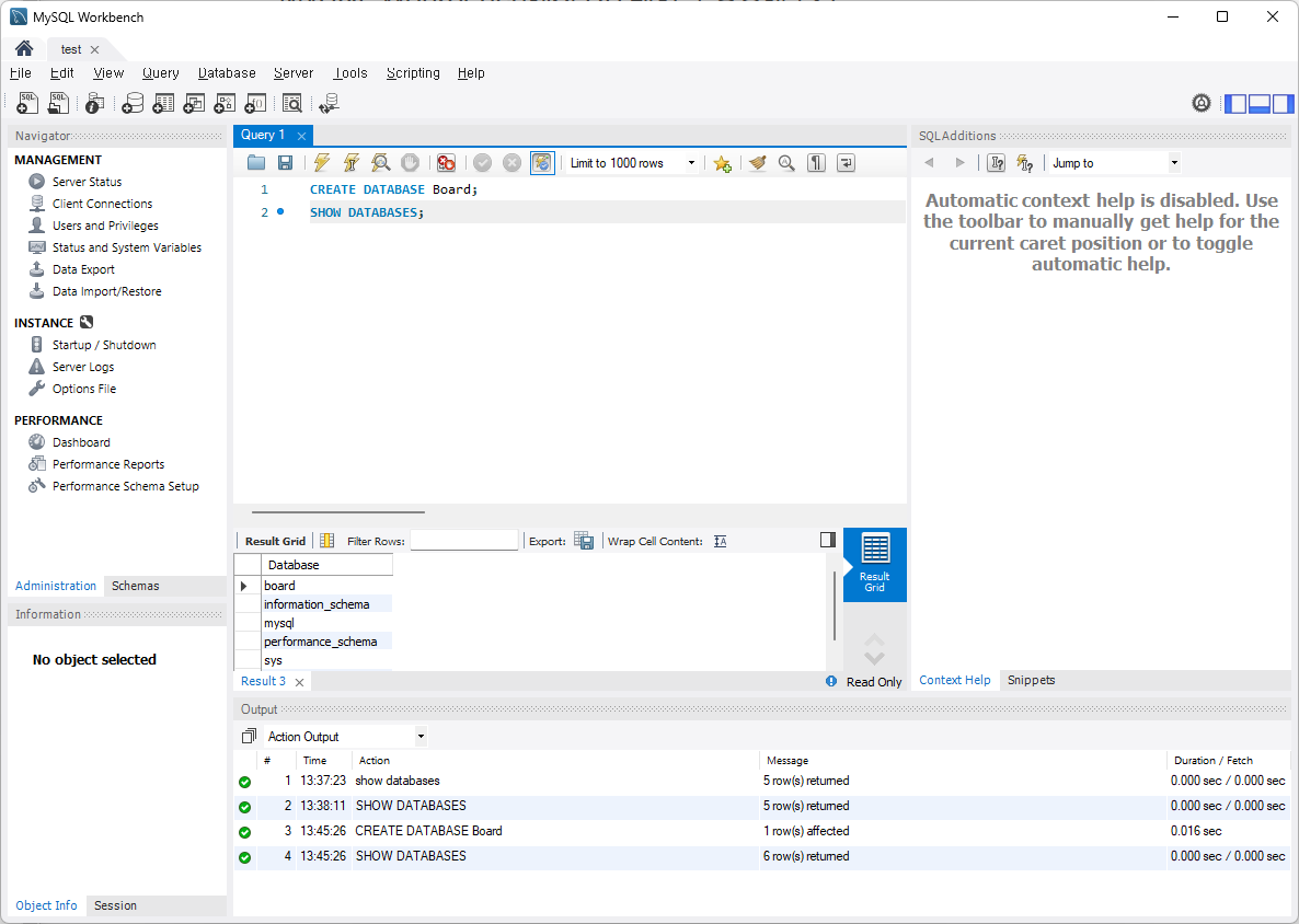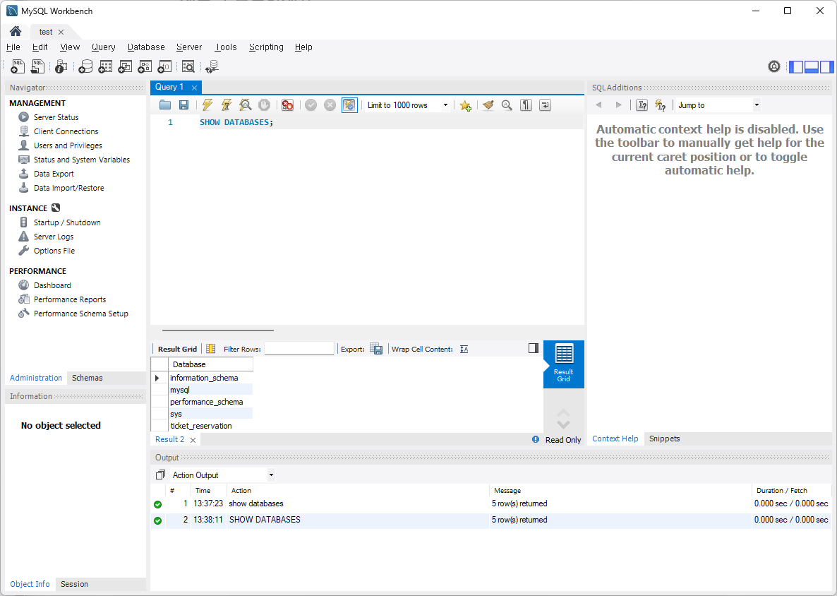 MySQL Workbench에서 데이터베이스들을 보고 싶다면 SHOW DATABASES; 명령을 사용하면 된다.
