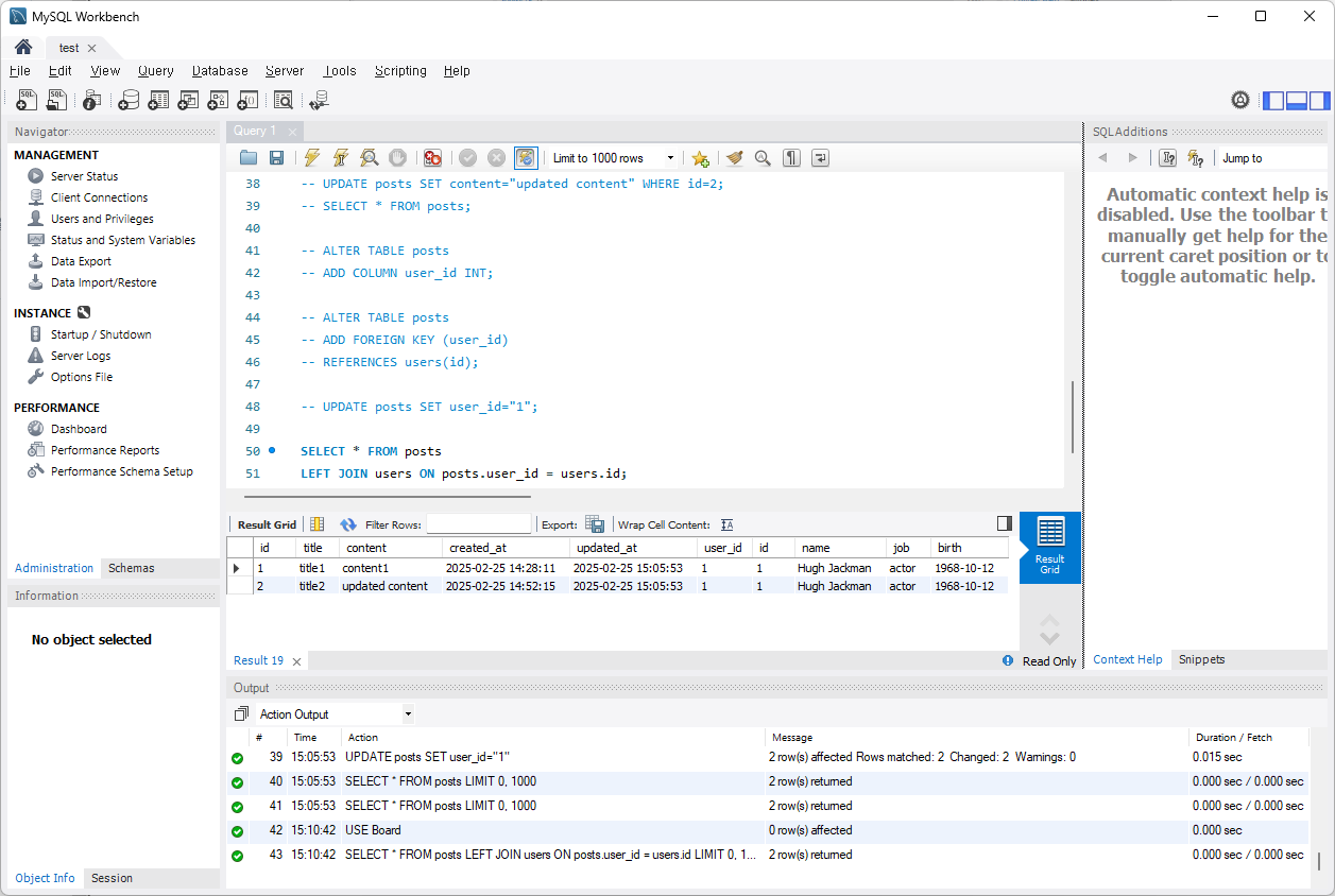 마지막으로 posts 테이블에서 글을 작성한 사용자 정보가 궁금할 때 사용할 수 있는 JOIN을 사용해보자