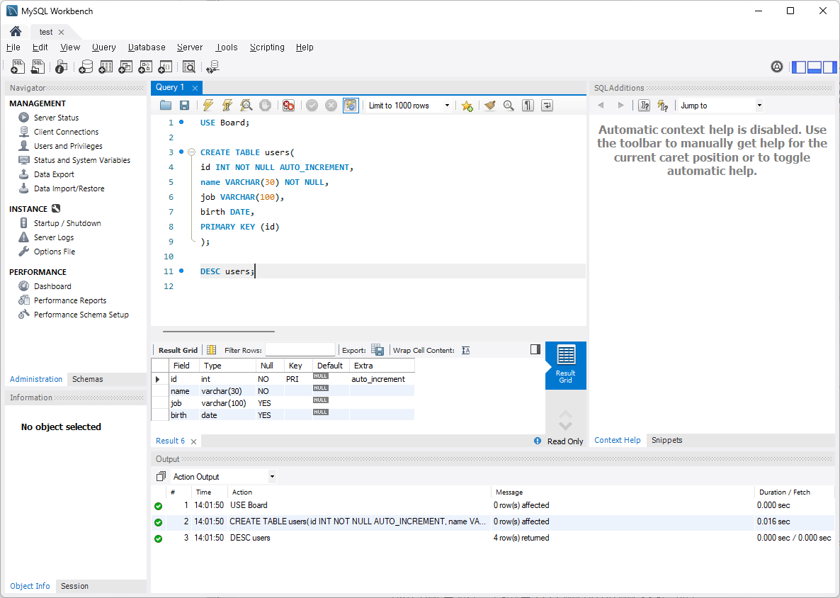 이제 board 데이터베이스에서 테이블을 만들어보자.