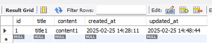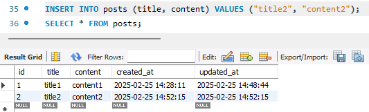 그리고 새로운 title2를 추가했을 때 updated_at도 TIMESTAMP가 잘 추가되는 것을 볼 수 있으며