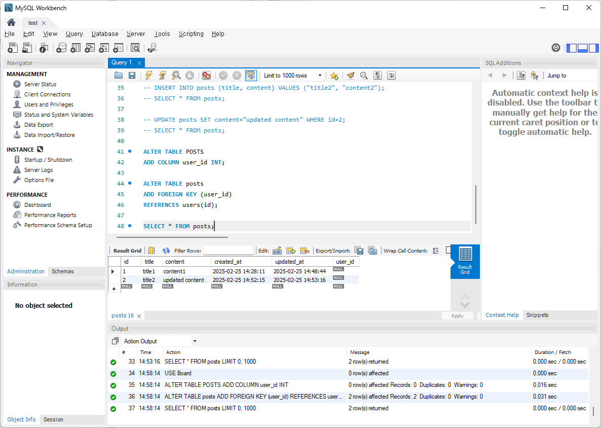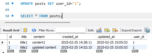 먼저 기존 posts에는 user_id라는 컬럼이 없었으므로 추가해주고,
