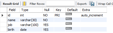 name은 VARCHAR 타입으로 NOT NULL, job은 VARCHAR 타입으로 NULLABLE이다.