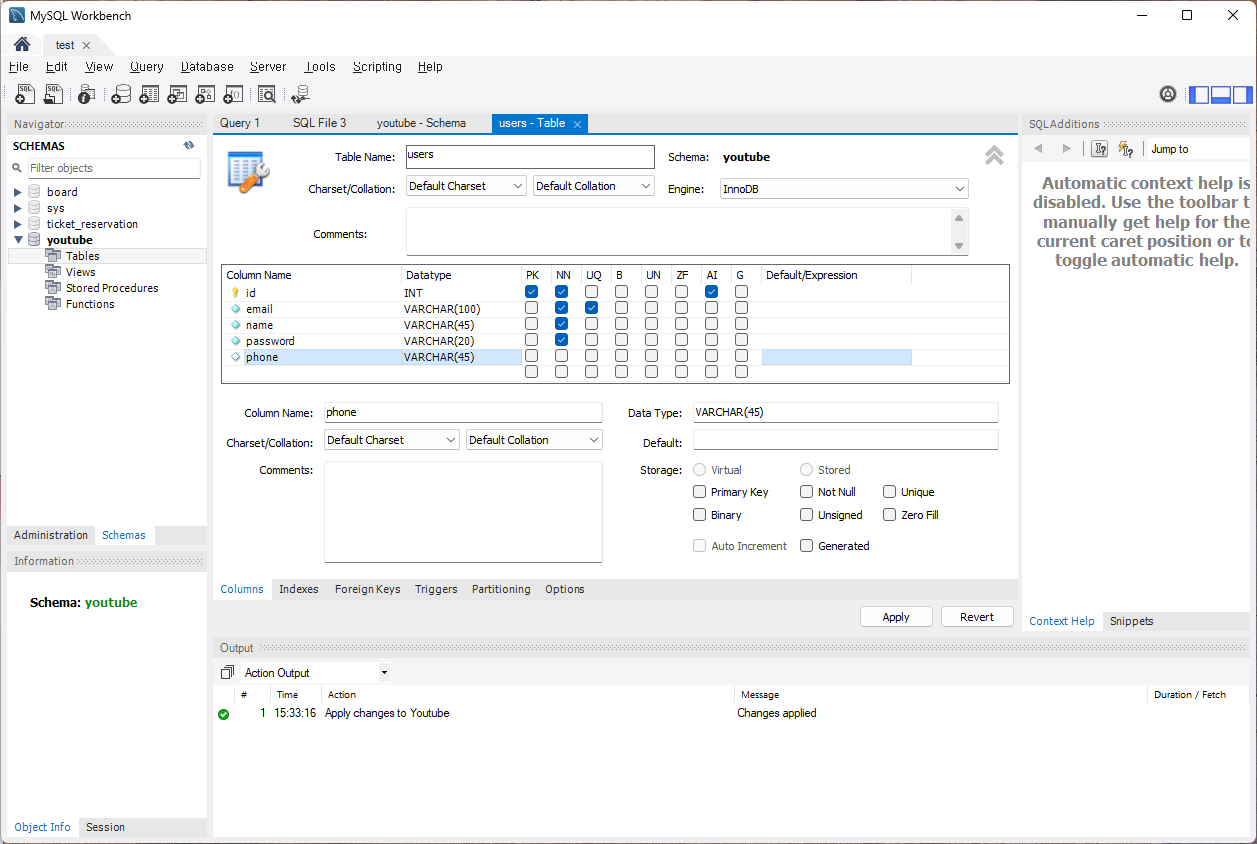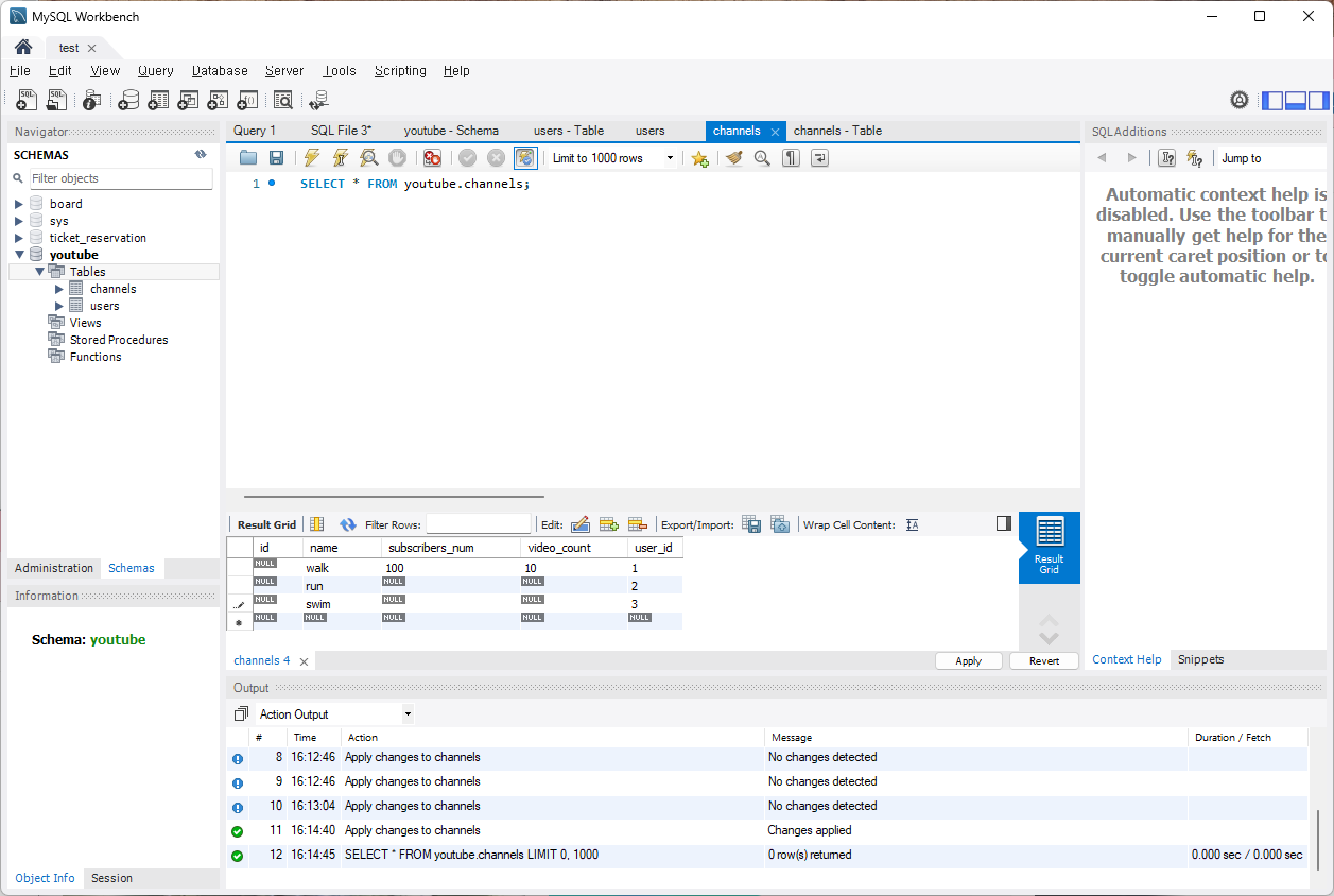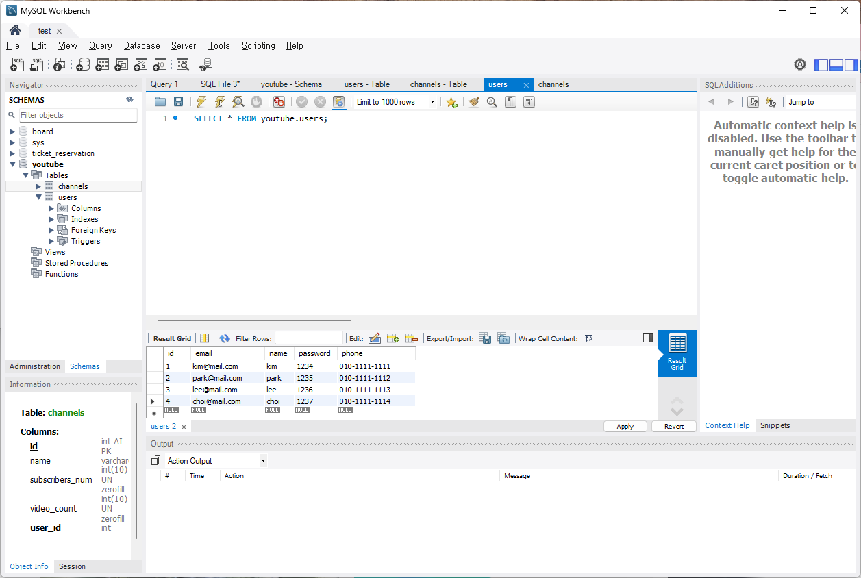 [MySQL] 유튜브 서비스 - 명령어 없이 스키마, 테이블 만들기 본문