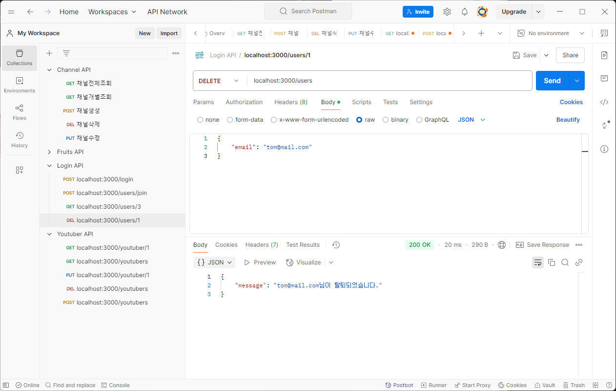 [Node.js] 유튜브 서비스 - 회원 개별 조회, 탈퇴(GET, DELETE)