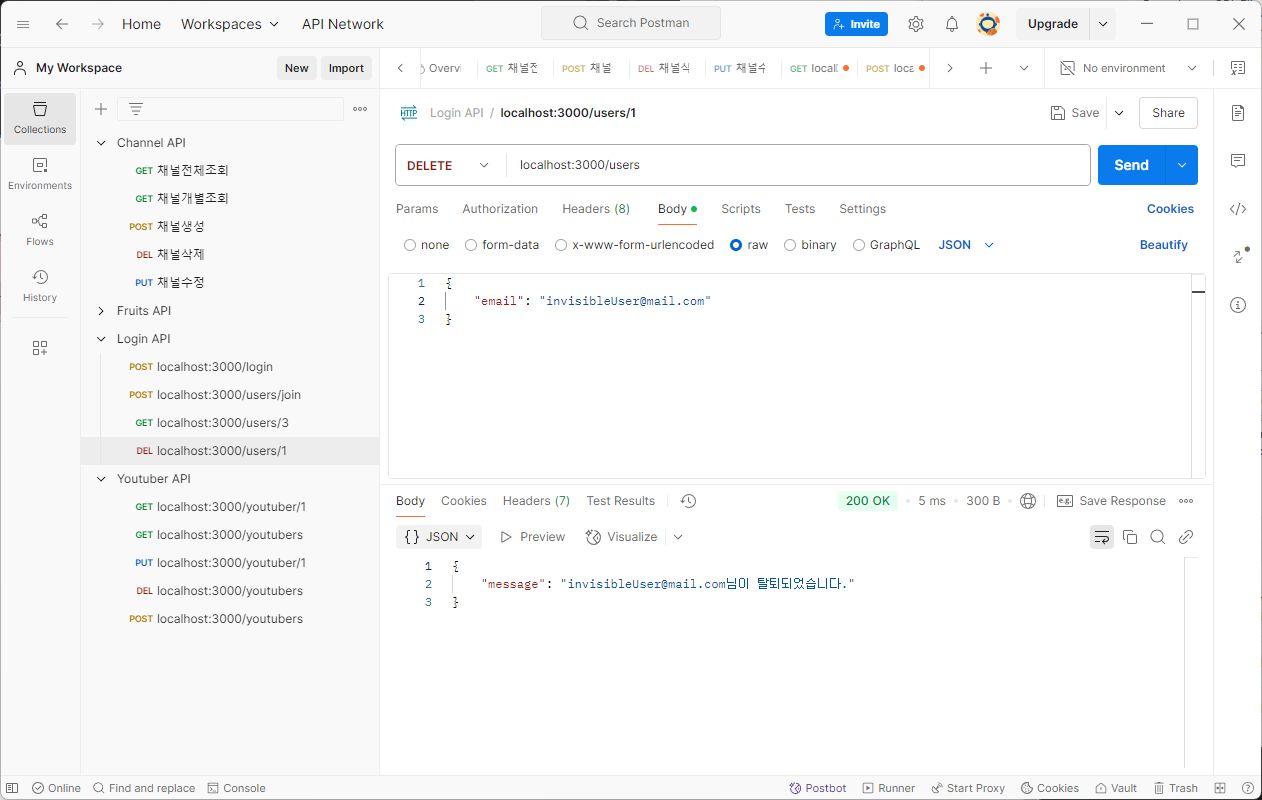 그런데 한 가지 문제가있는데, 데이터베이스에 저장되어있지 않은 email이라 하더라도 삭제되었다고 나오는 것이다.