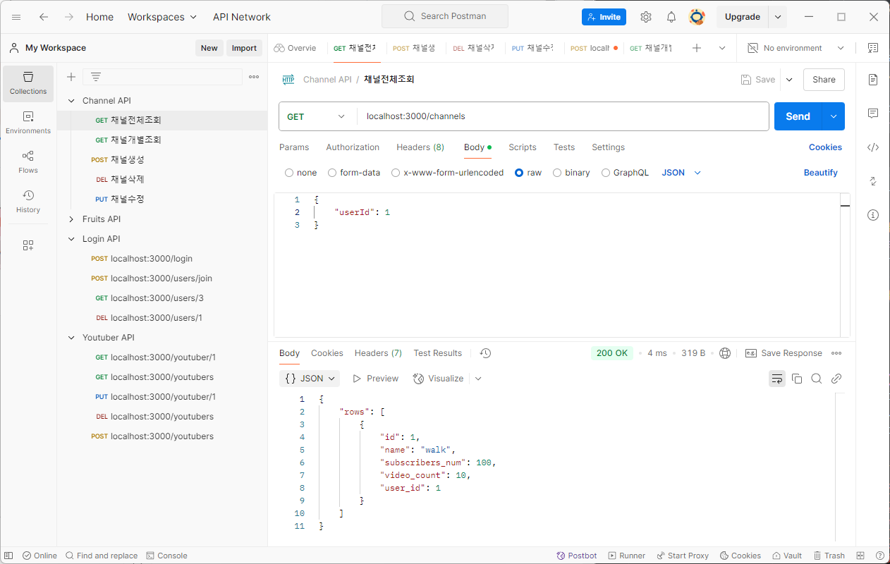 [Node.js] 유튜브 서비스 - 채널 생성, 채널 조회(POST, GET)