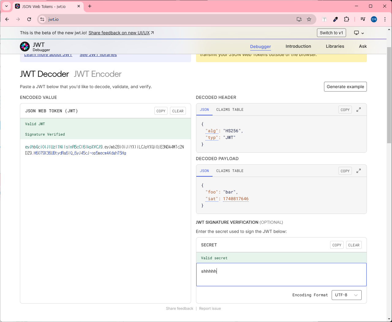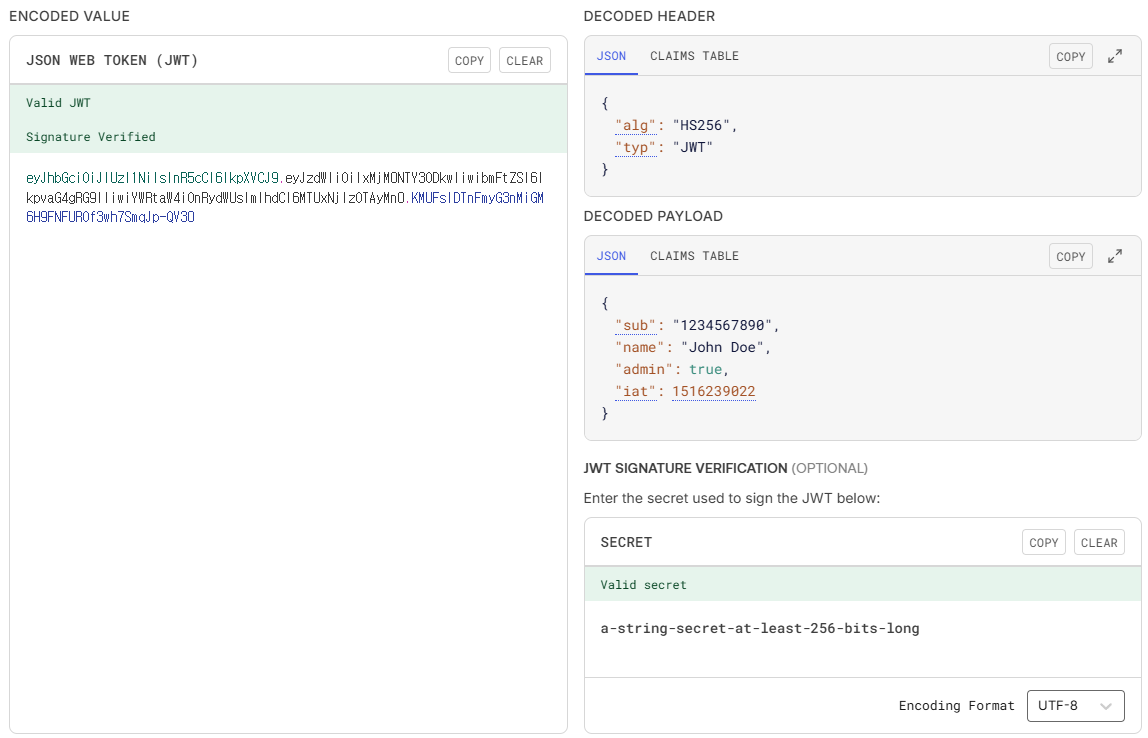이 값을 jwt.io에 넣고 SECRET란에 서명에 사용했던 "shhhhh"를 입력하면 성공적으로 복호화되어 결과가 나온다.