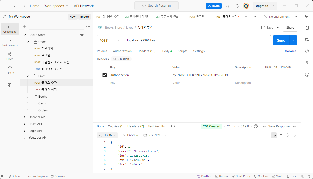 이제 "로그인"을 요구하는 모든 API에 JWT를 넣어 구현해보자.