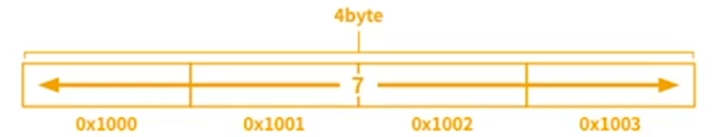 예를 들어 7이라는 32비트 정수는 다음과 같이 메모리주소 0x1000부터 0x1003까지 4바이트의 저장 공간에 저장된다.