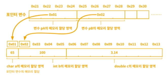 예를 들어 int *pA = &a; 와 같이 선언하면, 포인터 변수 pA는 변수 a의 주소값을 저장한다는 의미이다.