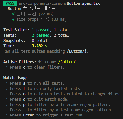 npm test Button과 같이 Button.spec.tsx에 해당되는 테스트만을 진행할 수도 있다.