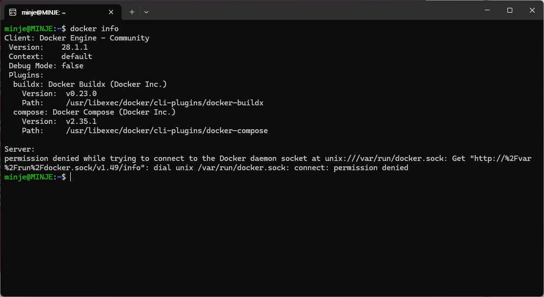 그러면 docker info를 입력하였을 때 정상적으로 서버에 대한 정보도 출력되는 것을 볼 수 있다.
