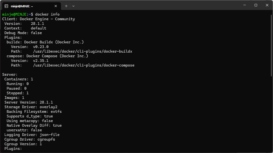 또한 docker info를 입력하였을 때 docker 정보가 잘 출력된다.