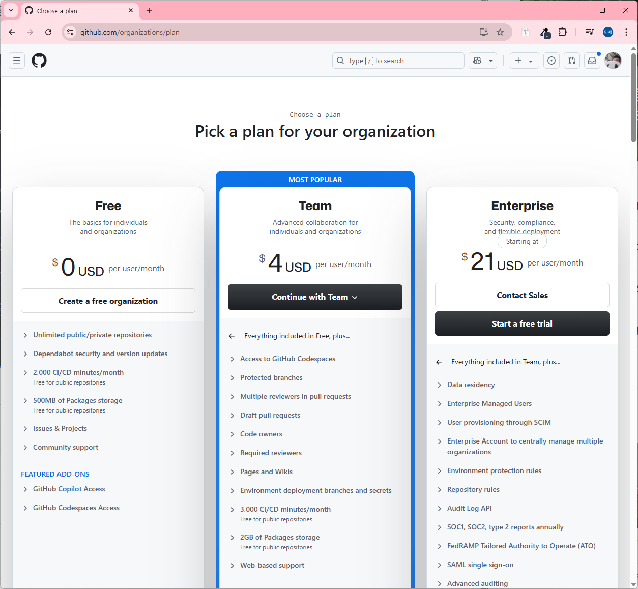 Free 칸에 있는 Create a free organization을 클릭한다.