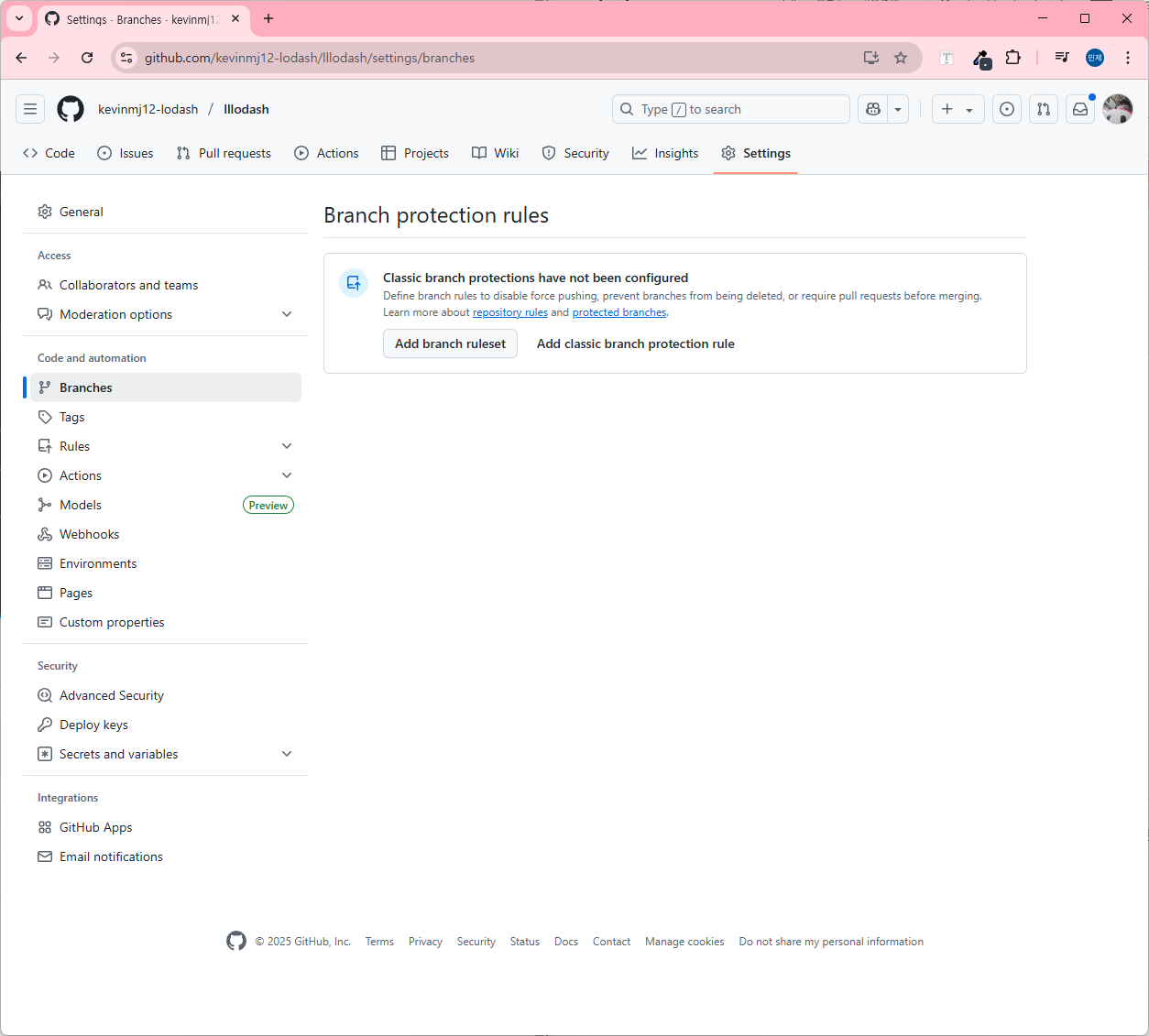레포지토리 작업이 끝났다면 브랜치 보호 세팅을 진행해주어야 한다.