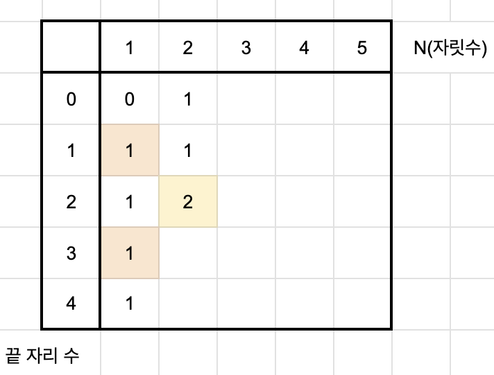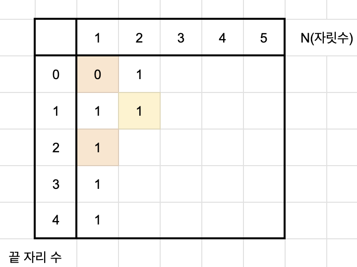 먼저 끝 자리수가 0인 경우는 "10" 한 가지로, 이는 자릿수가 1이고 끝 자리가 1일 때의 값과 같다