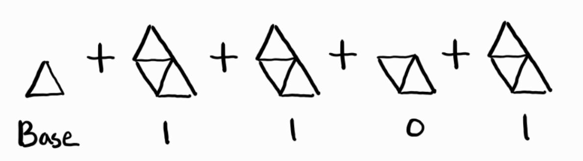 먼저 맨 왼쪽 아래 삼각형을 기본으로 삼고, 높이가 1일 때와 0일 때를 구분하면 [1, 1, 0, 1]을 위와 같이 표현할 수 있다.