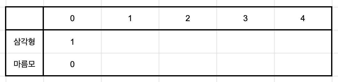 기본값은 삼각형 하나이기 때문에 dp[0][0]= 1, dp[0][1]=0이다.