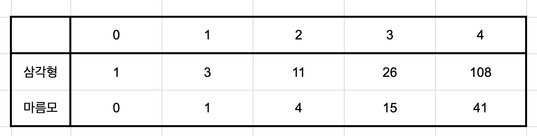 위 표의 행은 맨 오른쪽 타일이 삼각형 또는 마름모로 칠해질 때 경우의 수, 열은 n이다.