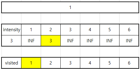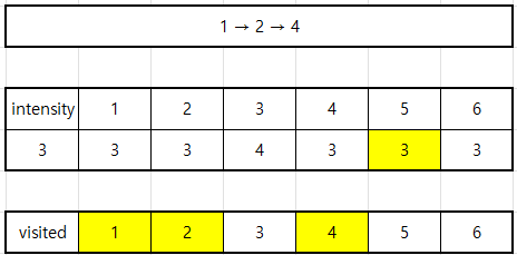 주의할 점으로 2번에서 4번으로 이동할 때 intensity는 2이지만 이전에 1 → 2로 이동할 때 intensity 값인 3이 더 크므로 2가 아닌 3이 저장되어야 한다.