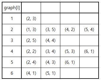 예를 들어 [1, 2, 3]이 있을 때 graph[1]에 (2, 3)을 저장한다.